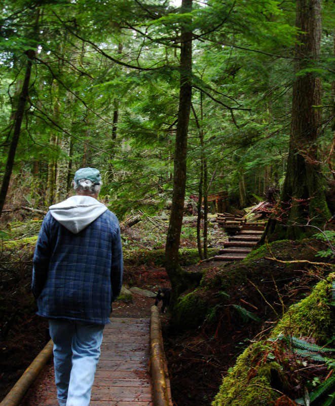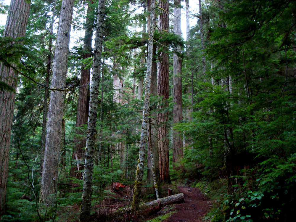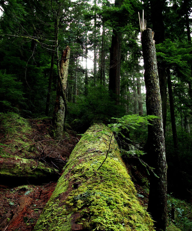 It's a fresh, green experience with tall trees of western Hemlocks, Douglas Firs, Red Cedars, Ferns and flowering bushes...depending on the time of year. Moss covers the ground and the trees, including those that have fallen long ago.