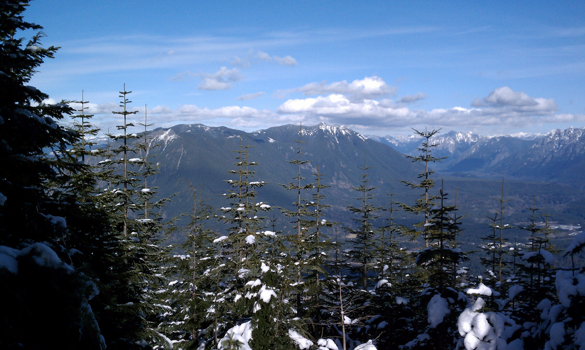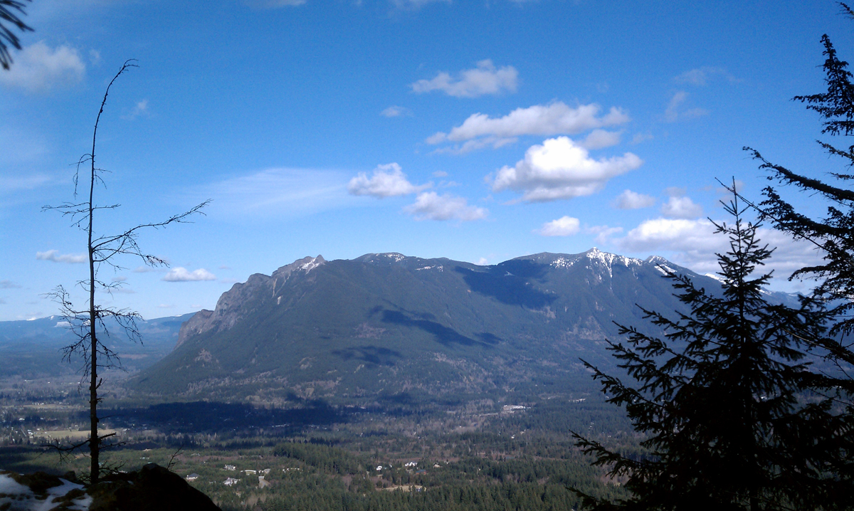 One mile into the hike is the first opening through the trees for a southerly view. It overlooks the protected Cedar River watershed and a view of Mount Lindsay. Another mile up from there is the real viewpoint...Rattlesnake Ledge.